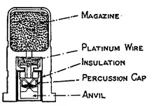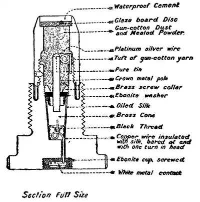 brass cones which are connected by a wire “bridge” of platinum silver. This bridge is surrounded by a priming composition of gun-cotton dust and mealed powder and the remainder of the tube is filled with powder. On an electric current passing, the bridge is heated to incandescence and ignites the priming composition.
