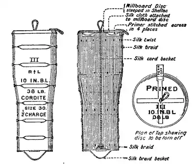 The cartridges are made of a bundle of cordite, or other smokeless powder, tightly tied with silk, placed in a silk cloth bag with the primer or igniter stitched on the unclosed end; the exterior is taped with silk cloth tape so as to form a stiff cartridge. For some of the longer guns, the exterior of the cartridge is conveniently made of a coned shape, the coned form being produced by building up layers outside a cylindrical core. In these large cartridges a silk cord becket runs up the centre with a loop at the top for handling (fig. 21).