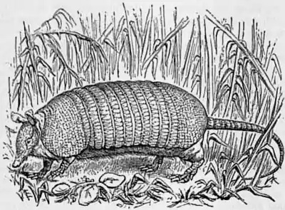 the species, and giving to the body a considerable degree of flexibility. The bony plates are overlain by horny scales. Armadillos are omnivorous, feeding on roots, insects, worms, reptiles and carrion, and are mostly, though not universally, nocturnal. They are harmless and inoffensive creatures, offering no resistance when caught; their principal means of escape being the extraordinary rapidity with which they burrow in the ground, and the tenacity with which they retain their hold in their subterranean retreats. Notwithstanding the shortness of their limbs they run with rapidity. Most of the species are esteemed good eating by the natives of the countries in which they live. They are all inhabitants of the open plains or the forests of the tropical and temperate parts of South America, with the exception of a few species which range as far north as Texas. The largest species is the giant armadillo (Priodon gigas), measuring nearly a yard long, from the forests of Surinam and Brazil; while one of the smallest is Dasypus minutus, a near ally of the larger D. sexcinctus. The peba (Tatusia novemcincta) represents a group with a large number of movable bands in the armour; while the apar (Tolypeutes tricinctus) and the other members of the same genus are remarkable for their power of rolling themselves up into balls. For the distinctive characters of these and the other genera see Edentata.