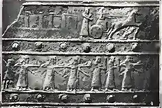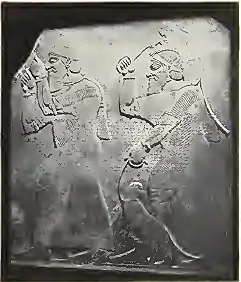 PORTION OF SCULPTURED PAVING SLAB FROM A DOORWAY IN ASSUR-BANI-PAL'S PALACE AT KUYUNJIK (NINEVEH).