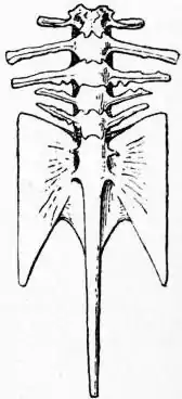 Skeleton.—In the earliest forms of this order, the Stegocephalia, we meet with considerable variety in the constitution of the vertebrae, and these modifications have been used for their classification. All agree, however, in having each vertebra formed of at least two pieces, the suture between which persists throughout life. In this they differ from the three orders which have living representatives. Even the inferior arches or chevrons of the tail of salamanders are continuously ossified with the centra. As a matter of fact, these vertebrae have no centra proper, that part which should correspond with the centrum being formed, as a study of the development has shown (H. Gadow, 14), by the meeting and subsequent complete co-ossification of the two chief dorsal and ventral pairs of elements (tail-vertebrae of Caudata), or entirely by the pair of dorsal elements. In the Ecaudata, the vertebrae of the trunk are formed on two different plans. In some the notochord remains for a long time exposed along the ventral surface, and, owing to the absence of cartilaginous formation around it, disappears without ever becoming invested otherwise than by a thin elastic membrane; it can be easily stripped off below the vertebrae in larval specimens on the point of metamorphosing. This has been termed the epichordal type. In others, which represent the perichordal type, the greater share of the formation of the whole vertebra falls to the (paired) dorsal cartilage, but there is in addition a narrow ventral or hypochordal cartilage which fuses with the dorsal or becomes connected with it by calcified tissue; the notochord is thus completely surrounded by a thick sheath in tadpoles with imperfectly developed limbs. This mode of formation of both the arch and the greater part or whole of the so-called centrum from the same cartilage explains why there is never a neuro-central suture in these batrachians.