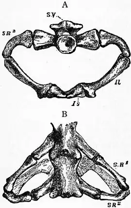 | Fig. 5.—Necturus. Posterior (A) and ventral (B) views of the sacral vertebrae (S.V.); S.R.1, S.R.2, sacral ribs; Il, ilium; Is, ischium. | Fig. 6.—Vertebral column of Hymenochirus (ventral view). |