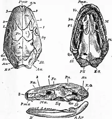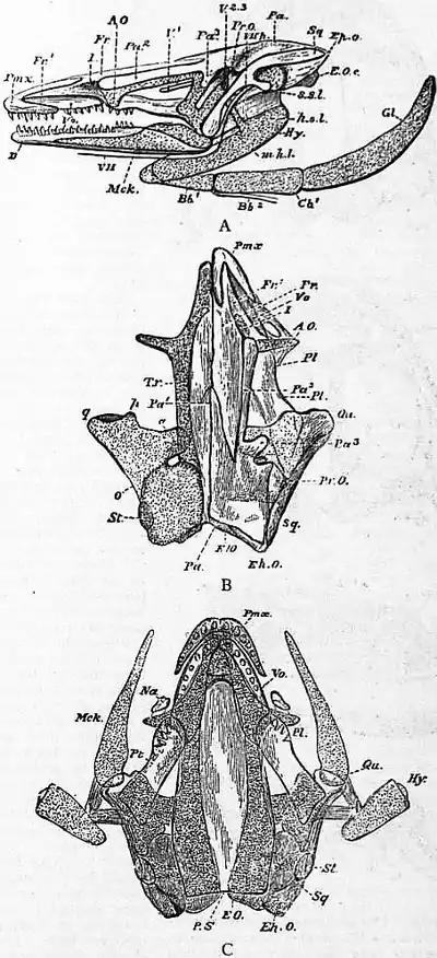 | Fig. 8.—The skull of Ichthyophis glutinosus. A, Dorsal; B, ventral; C, lateral view. The letters have the same signification as below. |