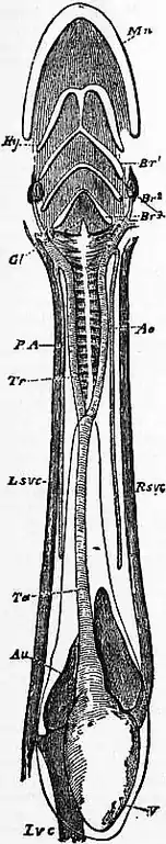 The organs of circulation cannot be dealt with here; the most important addition made to our knowledge in recent years being found in the contributions of F. Hochstetter (38) and of G. B. Howes (39), dealing with the azygous (posterior) cardinal veins in salamanders and some of the Ecaudata. The heart is situated quite forward, in the gular or pectoral region, even in those tailed batrachians which have a serpentiform body, whilst in the Apoda (fig. 13) it is moved back to a distance which is comparable to that it occupies in most of the snakes.