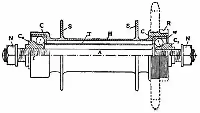 Bearings.—Ball bearings are universally used. Each row of balls runs between two ball-races of hardened steel, one on the stationary member, the other on the rotating member. The outer is called the “cup,” and the inner the “cone.” One of the four ball-races is adjustable axially so that the bearing may run without any shake. The ball-races are often made of separate pieces of steel, but the crank-axle usually has the cones formed integral with it, the necessary hardness being obtained by case-hardening. According as the two cups face outwards or inwards the bearing is said to have outward or inward cups, and according as the adjustable ball race is the cone or cup, the bearing is said to be cone-adjusting or cup-adjusting. Fig. 3 shows a ball-bearing hub with outward cups. The hub-shell H is turned out of mild steel, and the cups C are forced into the ends of the hub-shell and soldered thereto. A thin washer W is then spun into the end, for the purpose of retaining oil, and a thin internal tube T unites the two cups, and guides the oil fed in at the middle of the hub to the balls. The projecting flanges S are for the attachment of the tangent spokes used to build the hub into the wheel. The spindle A has the two cones screwed on it, one C1 against a shoulder, the other C2 adjustable. The spindle ends are passed through the back-fork ends and are there adjusted in position by the chain-tension adjusters. After adjustment the nuts N clamp the spindle securely between the fork-ends. The chain-wheel or free-wheel clutch is screwed on the end of the hub-shell, with a right-hand thread. The chain being at the right-hand side of the bicycle (as the rider is seated) the driving pull of the chain tends to screw the chain-wheel tight against the shoulder. A locking-ring R with a left-hand thread, screwed tight against the chain-wheel, prevents the latter from being unscrewed by back-pedalling. With a free-wheel clutch screwed on the hub, the locking-ring may be omitted.