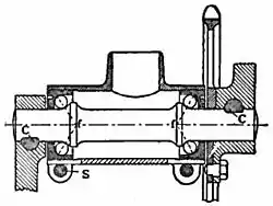 Fig. 5 shows diagrammatically the usual form of crank-axle bearing which has inward-cups and is cup-adjusting. The end of the bracket is split and the cup after adjustment is clamped in position by the clamping screw S. The usual mode of fastening the cranks to the axle is by round cotters C with a flat surface at a slight angle to the axis, thus forming a wedge, which is driven in tight. The small end of the cotter projects through the crank, and is screwed and held in place by a nut. The chain-wheel at the crank-axle is usually detachably fastened to the right-hand crank.