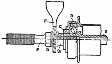 Fig. 4 shows one end of the cup-adjusting hub, with inward bearings. The cones are formed of one piece with the spindles, and the adjusting cup C is screwed in the end of the hub shell, and locked in position by the screwed locking-ring R. The figure also illustrates a divided spindle for facilitating the removal of the tire for repair when required without disturbing the wheel, bearings, chain or gear-case. The chain side of the hub-spindle, not shown in the figure, is secured to the frame in the usual way; on the left side the spindle S projects very little beyond the adjusting cup. A distance washer W is placed between the end of the spindle S and the fork-end F. A detachable screw-pin, or the footstep, P, passes through the chain-adjusting draw-bolt B, the fork-end F, and the distance washer W, and is screwed into the end of the spindle S, the hexagon head of the detachable pin drawing all the parts securely together. On unscrewing the detachable pin, the distance washer W drops out of place, leaving a clear space for removing the tire without disturbing any other part.