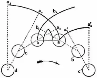 Gear and Crank-length.—The “gear” of a bicycle is given by the formula Dn1/n2 where D is the diameter of the driving wheel in inches, n1 and n2 the numbers of teeth on the crank-axle and hub chain-wheels respectively. At each revolution of the crank-axle, the bicycle is moved forward a distance equal to the circumference of the circle of diameter equal to the gear. Thus with a 28 in. diameter driving-wheel, 18 teeth on the hub chain-wheel, 45 teeth on the crank-axle chain-wheel, the bicycle is geared to 70 in. The usual crank-length is 612 to 7 in. Cranks of 712, 8 and 9 in. length can be had, but require a bicycle frame of special design. The gear should be roughly proportional to the crank-length. The gear 10 times the crank-length is a good proportion for an average rider.