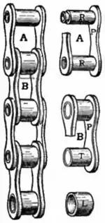 Chains.—There are two widely used types of chains. The “block” chain (fig. 7) consists of a series of central blocks connected by side plates. The “roller” chain (fig. 8) consists of a series of outside and inside links. The outside link A is made up of two steel side plates P united by two shouldered rivets R. The inside link B consists of two side plates P united by two tubular pieces T, which form bushes for the rivets R and pivots for the rollers L. The rivets, bushes and rollers are case-hardened.