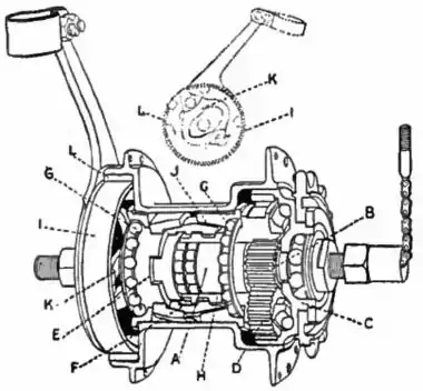 inside the hub, the whole combination being termed a coaster hub. Fig. 12 shows a sectional view of the Eadie two-speed coaster, in which the free-wheel clutch and brake are combined with a two-speed gear. The free-wheel clutch action is as follows: A forward pressure of the pedals turns the externally threaded driving cone H in the internally threaded cone F, the latter being thus forced to the right into engagement with the cup J which is screwed to the hub-shell, thus forming a friction driving clutch. The pedals being held stationary the driving cone H is stationary, and the hub running on the ball bearings G, the cone F travels towards the left until released from the cup J, when it also remains at rest. In this type of free-wheel clutch it is essential that there be little or no friction between the screwed surfaces of H and F, else on beginning to pedal, the cone F may remain stationary relative to the driving cone H, and no engagement between F and J may take place. If F be prevented from turning faster than the hub-shell, as is sometimes done by a light spring between the two, the engagement of the friction clutch must take place as soon as the pedals tend to move faster than the speed corresponding to that of the hub-shell.