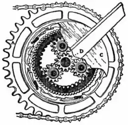 Fig. 13 is a sectional view of the Sunbeam two-speed gear which is arranged at the crank-axle, and clearly shows the relative disposition of the toothed wheel mechanism common to nearly all cycle speed gears. The chain-wheel is fixed to the annular wheel A; the planet carrier C is fixed to the crank; and when the sun-wheel D is held stationary, the chain-wheel is driven faster than the cranks. When the sun-wheel D is released, the planet carrier C drives the annular wheel A by the ratchet free-wheel clutch; the part thus revolves as a solid piece, and gives the normal or low speed. The gear-ratio is 133·3 : 100.