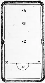 | A. The billiard spot measured from the nearest point of the face of the cushion. B. Pyramid spot. C. Centre spot. XY. Baulk line. D. Semicircle of 1112 in. radius, known as the D. |