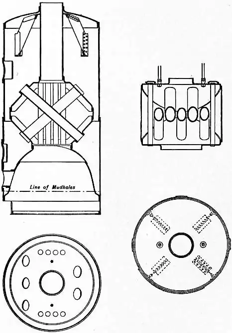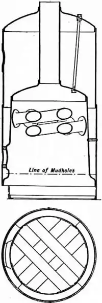 and a hand-hole closed by a suitable door is provided in the outer shell opposite to each tube for cleaning purposes. A boiler of this kind is illustrated in fig. 4. This form is often used on board ship for auxiliary purposes. Where more heating surface is required than can be obtained in the cross-tube boiler other types of vertical boiler are employed.