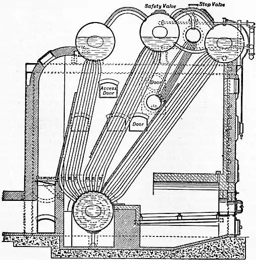A somewhat similar boiler is made by Messrs. Clarke, Chapman & Co., and is known as the “Woodeson” boiler (fig. 13). It consists of three upper drums placed side by side connected together by numerous short tubes, some above and some Woodeson.below the water-level, and of three smaller lower drums also connected by short cross tubes. The upper and lower drums are connected by numerous nearly vertical straight tubes. The whole is enclosed in firebrick casing. The design permits of the insides of all the tubes being readily inspected, and also of any tube being taken out and renewed without displacing any other part of the boiler.