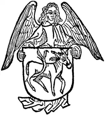 BOOK-PLATES. The book-plate, or ex-libris, a printed label intended to indicate ownership in individual volumes, is nearly as old as the printed book itself. It bears very much the same relation to the hand-painted armorial or otherwise symbolical personal device found in medieval manuscripts that the printed page does to the scribe’s work. The earliest known examples of book-plates are German. According to Friedrich Warnecke, of Berlin (one of the best authorities on the subject), the oldest movable ex-libris are certain woodcuts representing a shield of arms supported by an angel (fig. 1), which were pasted in books presented to the Carthusian monastery of Buxheim by Brother Hildebrand Brandenburg of Biberach, about the year 1480—the date being fixed by that of the recorded gift.