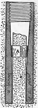 5. Diamond Drill.—The methods described above are capable of boring holes vertically downward only. By the diamond drill, holes can be bored in any direction, from vertically downward to vertically upward. It has the further advantage of making an annular hole from which is obtained a core, furnishing a practically complete cross-section of the strata penetrated; the thickness and character of each stratum are shown, together with its depth below the surface. Thus, the diamond drill is peculiarly well adapted for prospecting mineral deposits from which samples are desired. The first practical application of diamonds for drilling in rock was made in 1863 by Professor Rudolph Leschot, a civil engineer of Paris.