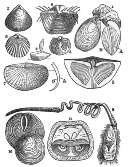The soft body of the Brachiopod is in all cases protected by a shell composed of two distinct valves; these valves are always, except in cases of malformation, equal-sided, but not equivalved. The valves are, consequently, essentially symmetrical, which is not the case with the Lamellibranchiata,—so much so, that certain Brachiopod shells were named Lampades, or lamp shells, by some early naturalists; but while such may bear a kind of resemblance to an antique Etruscan lamp, by far the larger number in no way resemble one. The shell is likewise most beautiful in its endless shapes and variations. In some species it is thin, semi-transparent and glassy, in others massive. Generally the shell is from a quarter of an inch to about 4 in. in size, but in certain species it attains nearly a foot in breadth by something less in length, as is the case with Productus giganteus. The valves are also in some species very unequal in their respective thickness, as may be seen in Productus (Daviesiella)[1] llangollensis, Davidsonia verneuilii, &c., and while the space allotted to the animal is very great in many species, as in Terebratula sphaeroidalis, it is very small in others belonging to Strophomena, Leptaena, Chonetes, &c. The ventral valve is usually the thickest, and in some forms is six or seven times as great as the opposite one. The outer surface of many of the species presents likewise the most exquisite sculpture, heightened by brilliant shades, or spots of green, red, yellow and bluish black. Traces of the original colour have also been preserved in some of the fossil forms; radiating bands of a reddish tint have been often seen in well-preserved examples of Terebratula (Dielasma) hastata, T. (Dielasma) sacculus, T. communis, T. biplicata, and of several others. Some specimens of T. carnea are of a beautiful pale pink colour when first removed from their matrix, and E. Deslongchamps has described the tint of several Jurassic species.