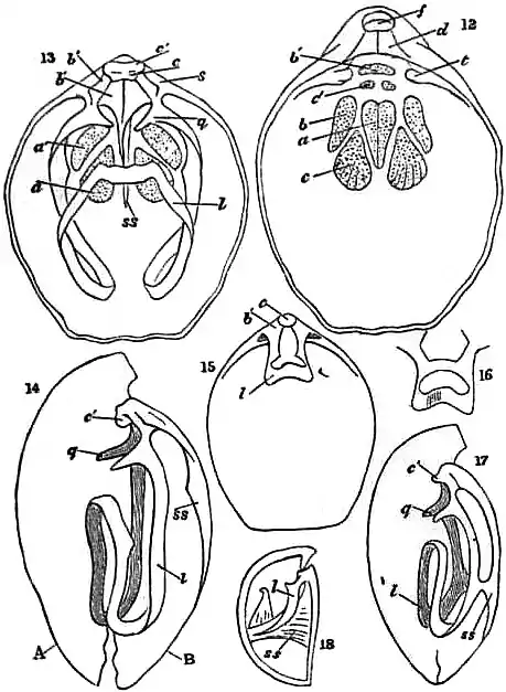 f, foramen; d, deltidium; t, teeth; a, adductor impressions (=occlusors, Hancock); c, divaricator (=cardinal muscles, King, = muscles diducteurs principaux, Gratiolet); c′, accessory divaricators (muscles diducteurs accessoires, Gratiolet); b, ventral adjuster (= ventral peduncular muscles, or muscles du pedoncule paire supérieure, Gratiolet); b′, peduncular muscle. 13. Magellania [Waldheimia] flavescens. Interior of dorsal valve. 14. Magellania [Waldheimia] flavescens. Longitudinal section of 15. Terebratula (Liothyris) vitrea. Interior of dorsal valve. l, loop; 16. Loop of Terebratulina caput serpentis. 17. Longitudinal section of Terebratella dorsata. (References as 18. Longitudinal section of Magas pumilus. |