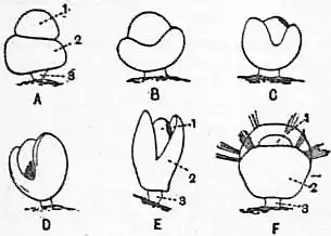 C. E. E. Beecher (Amer. Jour. Sci. ser. 3, xli. and xliv.) has classified with appropriate names the various stages through which Brachiopod larvae pass. The last stage, that in which the folds of the second segment are already reflected over the first, he calls the Typembryo. Either before or just after turning, the mantle develops a larval shell termed the protegulum, and when this is completed the larva is termed the Phylembryo. By this time the eyes have disappeared, the four bundles of chaetae have dropped off, and the lophophore has begun to appear as an outgrowth of the dorsal mantle lobe. The protegulum has been found in members of almost all the families of Brachiopod, and it is thought to occur throughout the group. It resembles the shell of the Cambrian genus Iphidea [Paterina], and the Phylembryo is frequently referred to as the Paterina stage. In some orders the Phylembryo is succeeded by an Obolella stage with a nearly circular outline, but this is not universal. The larva now assumes specific characters and is practically adult.
