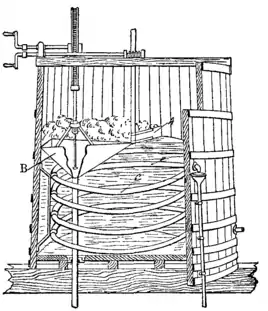 (A) In (a) the Skimming System the fermentation from start to finish takes place in wooden vessels (termed “squares” or “rounds”), fitted with an attemperator and a parachute or other similar skimming device for removing or “skimming” the yeast at the end of the fermentation (fig. 4). The principle of (b) the Dropping System is that the beer undergoes only the main fermentation in the “round” or “square,” and is then dropped down into a second vessel or vessels, in which fermentation and cleansing are completed. The ponto system of dropping, which is now somewhat old-fashioned, consists in discharging the beer into a series of vat-like vessels, fitted with a peculiarly-shaped overflow lip. The yeast works its way out of the vessel over the lip, and then flows into a gutter and is collected. The pontos are kept filled with beer by means of a vessel placed at a higher level. In the ordinary dropping system the partly fermented beer is let down from the “squares” and “rounds” into large vessels, termed dropping or skimming “backs.” These are fitted with attemperators, and parachutes for the removal of yeast, in much the same way as in the skimming system. As a rule the parachute covers the whole width of the back. (c) The Burton Union System is really an improved ponto system. A series of casks, supplied with beer at the cleansing stage from a feed vessel, are mounted so that they may rotate axially. Each cask is fitted with an attemperator, a pipe and cock at the base for the removal of the finished beer and “bottoms,” and lastly with a swan neck fitting through a bung-hole and commanding a common gutter. This system yields excellent results for certain classes of beers, and many Burton brewers think it is essential for obtaining