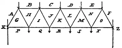 33. Graphic Method of finding the Stresses in Braced Structures.—Fig. 65 shows a common form of bridge truss known as a Warren girder, with lines indicating external forces applied to the joints; half the load carried between the two lower joints next the piers on either side is directly carried by the abutments. The sum of the two upward vertical reactions must clearly be equal to the sum of the loads. The lines in the diagram represent the directions of a series of forces which must all be in equilibrium; these lines may, for an object to be explained in the next paragraph, be conveniently named by the letters in the spaces which they separate instead of by the method usually employed in geometry. Thus we shall call the first inclined line on the left hand the line AG, the line representing the first force on the top left-hand joint AB, the first horizontal member at the top left hand the line BH, &c; similarly each point requires at least three letters to denote it; the top first left-hand joint may be called ABHG, being the point where these four spaces meet. In this method of lettering, every enclosed space must be designated by a letter; all external forces must be represented by lines outside the frame, and each space between any two forces must receive a distinctive letter; this method of lettering was first proposed by O. Henrici and R. H. Bow (Economics of Construction), and is convenient in applying the theory of reciprocal figures to the computation of stresses on frames.