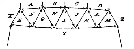 The external forces on a frame or bridge in equilibrium under those forces may, by a well-known proposition in statics, be represented by a closed polygon, each side of which is parallel to one force, and represents the force in magnitude as well as in direction. The sides of the polygon may be arranged in any order, provided care is taken so to draw them that in passing round the polygon in one direction this direction may for each side correspond to the direction of the force which it represents.