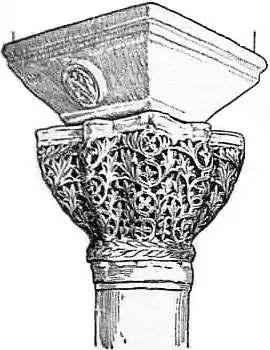 The earliest type of capital in Lombardy and Germany is that which is known as the cushion-cap, in which the lower portion of the cube block has been cut away to meet the circular shaft (fig. 11). These early types were generally painted at first with various geometrical designs, afterwards carved.