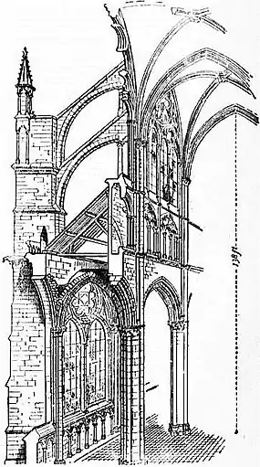 Returning now to the great cathedrals in the north of France, we give an illustration (fig. 8) of Amiens cathedral (from Viollet le Duc’s Dictionnaire raisonné) which shows the disposition of a cathedral, with its nave-arches, triforium, clerestory windows and vault, the flying buttresses which were required to carry the thrust of the vault to the outer buttresses which flanked the aisle walls, and the lofty pinnacles which surmounted them. In this case there was no triforium gallery, owing to the greater height given to the aisles. In Notre Dame at Paris the triforium was nearly as high as the aisles; in large towns this feature gave increased accommodation for the congregation, especially on the occasion of great fêtes, and it is found in Noyon, Laon, Senlis and Soissons cathedrals, built in the latter part of the 12th century; later it was omitted, and a narrow passage in the thickness of the wall only represented the triforium; at a still later period the aisles were covered with a stone pavement of slight fall so as to allow of loftier clerestory windows.