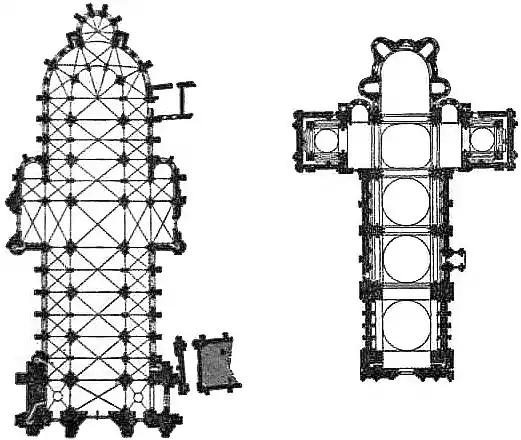 The cathedrals in Spain follow on the same lines as those in France. The cathedral of Santiago de Compostela is virtually a copy of St Sernin at Toulouse, consisting of nave and aisles, transepts and aisles, and a choir with chevet of five chapels; at Leon there is a chevet with five apsidal chapels, and at Toledo an east end with double aisles round the apse with originally seven small apsidal chapels, two of them rebuilt at a very late period. At Leon, Barcelona and Toledo the processional passage round the apse with apsidal chapels recalls the French disposition, there being a double aisle around the latter, but in Leon and Toledo cathedrals the east end is masked externally by other buildings, so that the beauty of the chevet is entirely lost. At Avila and Salamanca (old cathedral) the triapsal arrangement is adopted, and the same is found in the German cathedrals, with one important exception, the cathedral of Cologne, which was based on that of Amiens, the comparative height of the former, however, being so exaggerated that scale has been lost, and externally it has the appearance of an overgrown monster.