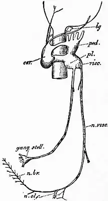 bg, Buccal ganglion. cer, Cerebral ganglion. ped, Pedal ganglion. pl, Pleural, and visc., visceral region of the pleuro-visceral ganglion. gang. stell, The right stellate ganglion of the mantle connected by a nerve to the pleural portion. n.visc, The right visceral nerve. n.olf, Its (probably) olfactory branches. n.br, Its branchial branches. |