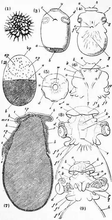 2. Lateral view of the egg at a little later stage. a, Limit to which the layer of cleavage-cells has spread over the egg; b, portion of the egg (shaded) as yet uncovered by cleavage-cells; ap, the auto-plasts; kp, cleavage-pole where first cells were formed. 3. Later stage, the limit (a) now extended so as to leave but little of the egg-surface (b) unenclosed. The eyes (d), mouth (e) and mantle-sac (u) have appeared. 4. Later stage, anterior surface, the embryo is becoming nipped off from the yolk-sac (g). 5. View of an embryo similar to (3) from the cleavage-pole or centro-dorsal area. 6. Later stage, posterior surface. 7. Section in a median dorso-ventral and antero-posterior plane of an embryo of the same age as (4). 8. View of the anterior face of an older embryo. 9. View of the posterior face of an embryo of the same age as (8). |