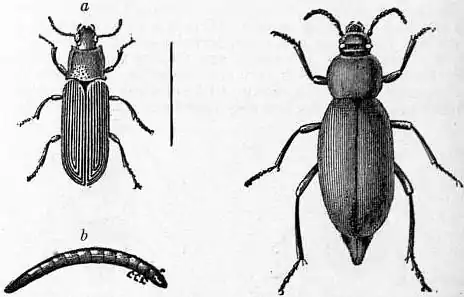 | Fig. 21.—(a) Tenebrio molitor (Flour Beetle). Europe. (b) Larva, or mealworm. |