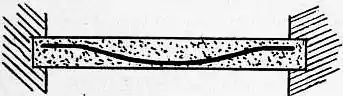 But it is in the design of steel concrete beams that the greatest ingenuity has been shown, and almost every patentee of a “system” has some new device for arranging the steel reinforcement to the best advantage. Concrete by itself, though strong in compression, can offer but little resistance to tensile and shearing stresses, and as these stresses always occur in beams the problem arises how best to arrange the steel so as to assist the concrete in bearing them. To meet tensile stresses the steel is nearly always inserted in the form of bars running along the beam. Figs. 6 to 9 show how they are arranged for different loading. In each case the object is to place the bars as nearly as possible where the tensile stresses occur. In cases where all the stresses are heavy, that portion of the beam which is under compression is similarly reinforced, though with smaller bars (figs. 10 and 11). But as these tension and compression bars are generally placed near the under and upper surface of the beam they are of little use in helping to resist the shearing stresses which are greatest at its neutral axis. (See Bridges.) These shearing stresses in a heavily loaded beam would cause it to split horizontally at or near the centre. To prevent this many ingenious devices have been introduced. (1) Perhaps one of the most efficient is a diagonal bracing of steel wire passing to and fro between the upper and lower bars and firmly secured to each by lapping or otherwise (fig. 12); this device is used in the Coignet and other French systems. (2) In the Hennebique system (which has found great favour in England) vertical bands or “stirrups,” as they are generally called, of hoop steel are used (fig. 13). They are of U shape, and passing round the tension bars extend to the top of the beam (figs. 14 and 3). They are exceedingly thin, but being buried in concrete no danger of their perishing from rust is to be feared. (3) In the Boussiron system a similar stirrup is used, but instead of being vertical the two parts are spread so that each is slightly inclined. (4) In the Coularon system, the stirrups are inclined as in fig. 15, and consist of rods, the ends of which are hooked over the tension and compression bars. (5) In the Kahn system the stirrups are similarly arranged, but instead of being merely secured to the tension bar, they form an integral part of it like branches on a stem, the bar being rolled to a special section to admit of this. (6) In many systems such as the “expanded metal” system, the tension and compression rods together with the stirrups are all abandoned in favour of a single rolled steel joist of I section, buried in concrete (see fig. 16). Probably the weight of steel used in this way is excessive, but the joists are cheap, readily procurable and easy to handle.