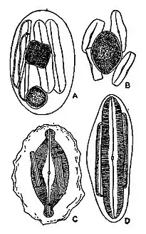 | Fig. 6.—Formation of Auxospores. A. Navicula limosa. B. Achnanthes flexella. C. Navicula Amphisbaena. D. Navicula viridis. |