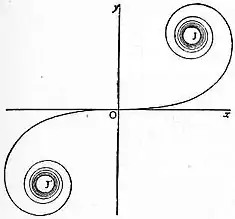 Cornu remarks that this equation suffices to determine the general character of the curve. For the osculating circle at any point includes the whole of the curve which lies beyond; and the successive convolutions envelop one another without intersection.