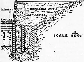 at Genoa were founded under water on a rubble mound in a similar manner by the aid of compressed air (fig. 15). Quay walls also on the Clyde have been founded on caissons, consisting of a bottomless steel structure, surmounted by a brick superstructure having hollows filled with concrete, in lengths of 80 ft. and 27 ft., and widths of 18 ft. and 21 ft. respectively, carried down by means of compressed air from 54 to 70 ft. below quay-level, on the top of which a continuous wall of concrete, faced with brickwork, and having a granite coping, was built up from near low-water level (fig. 16). In many cases where soft strata extend to considerable depths, river quays and basin walls have been constructed by building a light quay wall upon a series of bearing and raking piles driven into, and if possible through, the soft alluvium. Thus the walls along the Seine, and round the basins at Rouen, were built upon bearing piles carried down through the alluvial bed of the river to the chalk. The lower portion of the quay wall was constructed of concrete faced with brickwork within water-tight timber caissons, resting upon the piles at a depth of 934 ft. below low water; and upon this a rubble wall faced with bricks was erected from low water to quay-level, backed by rubble stone laid on a timber flooring supported by piles, together with chalk, to form a quay right back to the top of the slope of the bank of the deepened river (fig. 17). The quay walls of the open basins bordering the Hudson river at New York have had, in certain parts, to be founded on bearing piles combined with raking piles, driven into a thick bed of soft silt where no firm stratum could be reached, and where, therefore, the weight could only be borne by the adherence of the long piles in the silt. Before driving the piles, however, the silt round the upper part of the piles and under the quay wall was consolidated by depositing small stones in a trench dredged to a depth of 30 ft. below low water; the piles were driven through these stones, and were further kept in place by a long toe of rubble stone in front and a backing of rubble stone behind carried nearly up to quay-level, behind which a light filling of ashes and earth was raised to quay-level. The slight quay wall resting upon the front rows of bearing piles was carried up under water by 70-ton concrete blocks deposited by means of a floating derrick; and the upper part of the wall was built of concrete faced with ashlar masonry (fig. 18). The basin and quay walls at Bremen, Bremerhaven and Hamburg were built on a series of bearing and raking piles driven down to a firm stratum, the wall being begun a few feet below low water. At Southampton, ferro-concrete piles were employed in constructing the deep quays; and a wharfing of timber pilework has been frequently used for river quays.