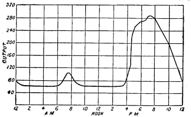 The general arrangements of a low-pressure continuous-current town supply station are as follows:—If steam is the motive power selected, it is generated under all the best conditions of economy by a battery of boilers, and supplied to engines which are now almost invariably Low-pressure continuous supply.coupled direct, each to its own dynamo, on one common bedplate; a multipolar dynamo is most usually employed, coupled direct to an enclosed engine. Parsons or Curtis steam turbines (see Steam-Engine) are frequently selected, since experience has shown that the costs of oil and attendance are far less for this type than for the reciprocating engine, whilst the floor space and, therefore, the building cost are greatly reduced. In choosing the size of unit to be adopted, the engineer has need of considerable experience and discretion, and also a full knowledge of the nature of the public demand for electric current. The rule is to choose as large units as possible, consistent with security, because they are proportionately more economical than small ones. The over-all efficiency of a steam dynamo—that is, the ratio between the electrical power output, reckoned say in kilowatts, and the I.H.P. of the engine, reckoned in the same units—is a number which falls rapidly as the load decreases, but at full load may reach some such value as 80 or 85%. It is common to specify the efficiency, as above defined, which must be attained by the plant at full-load, and also the efficiencies at quarter- and half-load which must be reached or exceeded. Hence in the selection of the size of the units the engineer is guided by the consideration that whatever units are in use shall be as nearly as possible fully loaded. If the demand on the station is chiefly for electric lighting, it varies during the hours of the day and night with tolerable regularity. If the output of the station, either in amperes or watts, is represented by the ordinates of a curve, the abscissae of which represent the hours of the day, this load diagram for a supply station with lighting load only, is a curve such as is shown in fig. 1, having a high peak somewhere between 6 and 8 p.m. The area enclosed by this load-diagram compared with the area of the circumscribing rectangle is called the load-factor of the station. This varies from day to day during the year, but on the average for a simple lighting load is not generally above 10 or 12%, and may be lower. Thus the total output from the station is only some 10% on an average of that which it would be if the supply were at all times equal to the maximum demand. Roughly speaking, therefore, the total output of an electric supply station, furnishing current chiefly for electric lighting, is at best equal to about two hours’ supply during the day at full load. Hence during the greater part of the twenty-four hours a large part of the plant is lying idle.