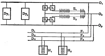 Assuming current to be supplied at about 460 volts by different and separate steam dynamos, Dy1, Dy2 (fig. 2), the machines are connected through proper amperemeters and voltmeters with omnibus bars, O1, O2, O3, on a main switchboard, so that any dynamo can be put in connexion Three-wire system.or removed. The switchboard is generally divided into three parts—one panel for the connexions of the positive feeders, F1, with the positive terminals of the generators; one for the negative feeders, F3, and negative generator terminals; while from the third (or middle-wire panel) proceed an equal number of middle-wire feeders, F2. These sets of conductors are led out into the district to be supplied with current, and are there connected into a distributing system, consisting of three separate insulated conductors, D1, D2, D3, respectively called the positive, middle and negative distributing mains. The lamps in the houses, H1, H2, &c., are connected between the middle and negative, and the middle and positive, mains by smaller supply and service wires. As far as possible the numbers of lamps installed on the two sides of the system are kept equal; but since it is not possible to control the consumption of current, it becomes necessary to provide at the station two small dynamos called the balancing machines, B1, B2, connected respectively between the middle and positive and the middle and negative omnibus bars.