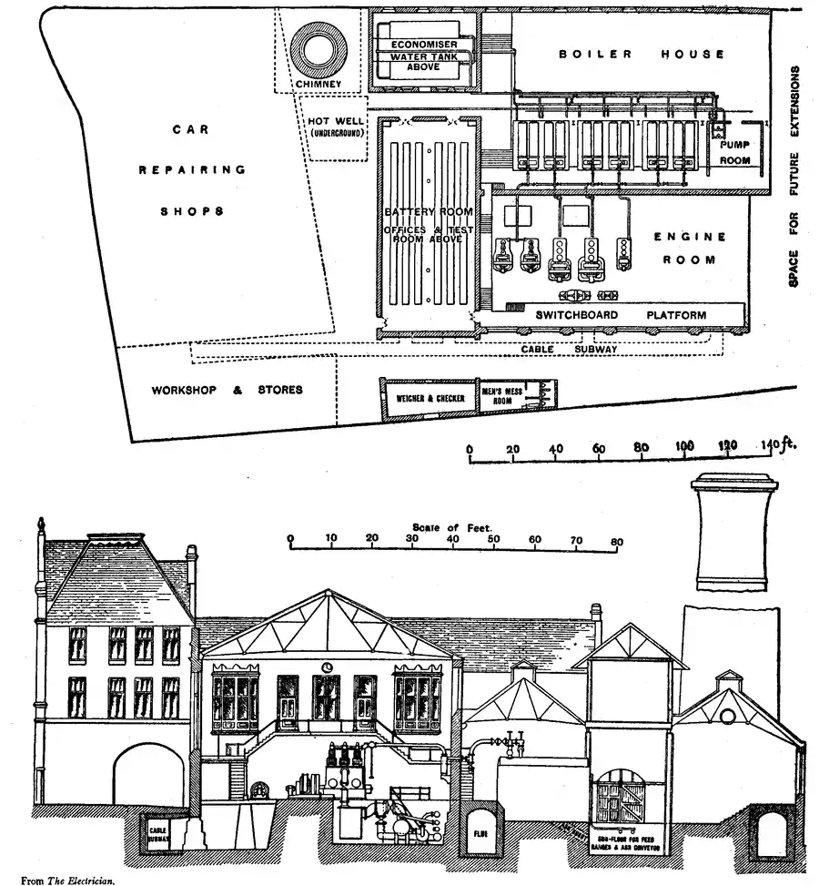 The general arrangements of a low-pressure supply station are shown in figs. 3 and 4. It consists of a boiler-house containing a bank of boilers, either Lancashire or Babcock & Wilcox being generally used (see Boiler), which furnish steam to the engines