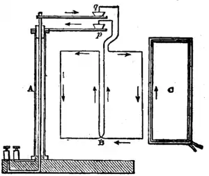 Action of one Current on Another.—The investigations of Ampère in connexion with electric currents are of fundamental importance in electrokinetics. Starting from the discovery of Oersted, Ampère made known the correlative fact that not only is there a mechanical action between a current and a magnet, but that two conductors conveying electric currents exert mechanical forces on each other. Ampère devised ingenious methods of making one portion of a circuit movable so that he might observe effects of attraction or repulsion between this circuit and some other fixed current. He employed for this purpose an astatic circuit B, consisting of a wire bent into a double rectangle round which a current flowed first in one and then in the opposite direction (fig. 5). In this way the circuit was removed from the action of the earth’s magnetic field, and yet one portion of it could be submitted to the action of any other circuit C. The astatic circuit was pivoted by suspending it in mercury cups q, p, one of which was in electrical connexion with the tubular support A, and the other with a strong insulated wire passing up it.
