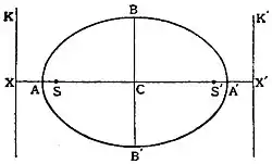 Fig. 1. SX be divided at A so that SA/AX = e, then A is a point on the curve. SX may be also divided externally at A′, so that SA′/A′X = e, since e is less than unity; the points A and A′ are the vertices, and the line AA′ the major axis of the curve. It is obvious that the curve is symmetrical about AA′. If AA′ be bisected at C, and the line BCB′ be drawn perpendicular to AA′, then it is readily seen that the curve is symmetrical about this line also; since if we take S′ on AA′ so that S′A′ = SA, and a line K′X′ parallel to KX such that AX = A′X′, then the same curve will be described if we regard K′X′ and S′ as the given directrix and focus, the eccentricity remaining the same. If B and B′ be points on the curve, BB′ is the minor axis and C the centre of the curve.