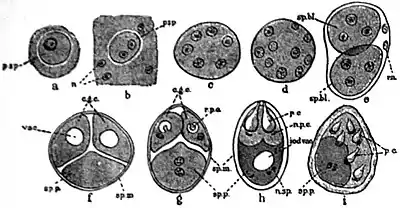 Fig. 4.—Stages in spore-formation. All the figures are from Myxobolus ellipsoides, except a and f, which are from M. pfeifferi. a, Differentiation of the pansporoblast (p.sp). b, Pansporoblast with two nuclei. c and d, Pansporoblasts with six and ten nuclei respectively; in d, four of the nuclei are degenerating. e, Pansporoblast segmented into two definitive sporoblasts, each with three nuclei. In the next four figures the definitive sporoblast, or the spore produced from it, is alone figured. f, Definitive sporoblast segmented into three masses, the capsulogenous cells (c.g.c) and the sporoplasm (sp.p), within an envelope, the spore membrane (sp.m). g, More advanced stage. h, Spore completely developed, with two polar capsules and sporoplasm containing an iodinophilous vacuole. i, Abnormal spore containing six polar capsules. | |