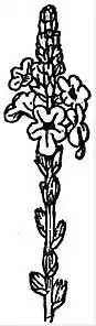 Fig. 12.—Spike of Vervain (Verbena officinalis), showing sessile flowers on a common rachis. The flowers at the lower part of the spike have passed into fruit, those towards the middle are in full bloom, and those at the top are only in bud. | ||