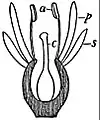 Figs. 28, 29 and 30.—Diagrams illustrating hypogyny, perigyny and epigyny of the flower. a, Stamens; c, carpels; p, petals; s, sepals. | ||
