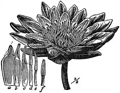 Figs. 31 and 32.—White Water Lily. Fig. 31, flower; fig. 32, successive stages, a-f, in the transition from petals to stamens. (After Wossidlo.) |