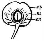 Fig. 5.—Fruit of Cherry (Prunus Cerasus) in longitudinal section. ep, Epicarp; m, mesocarp; en, endocarp. | ||