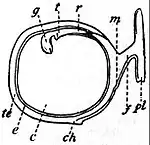 | Fig. 35.—Seed of Pea (Pisum) with one cotyledon removed. c, Remaining cotyledon; ch, chalaza-point at which the nourishing vessels enter; e, tegmen or inner coat; f, funicle or stalk; g, plumule of embryo; m, micropyle; pl, placenta; r, radicle of embryo; t, tigellum or stalk between root and plumule; te, testa. | |