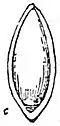 | Fig. 40.—Anatropal seed of the Orange (Citrus Aurantium) opened to show the chalaza c, which forms a brown spot at one end. | ||||