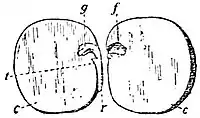 | Fig. 42.—The dicotyledonous embryo of the Pea laid open. c, c, The two fleshy cotyledons, or seed-lobes, which remain under ground when the plant sprouts; r, the radicular extremity of the axis whence the root arises; t, the axis (hypocotyl) bearing the young stalk and leaves g (plumule), which lie in a depression of the cotyledons f. |