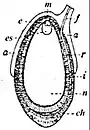 | Fig. 38.—Young anatropal seed of the white Water-lily (Nymphaea alba), cut vertically. It is attached to the placenta by the funicle f, cellular prolongations from which form an aril a a. The vessels of the cord are prolonged to the base of the nucellus n by means of the raphe r. The base of the nucellus is indicated by the chalaza ch, while the apex is at the micropyle m. The covering of the seed is marked i. n is the nucellus or perisperm, enclosing the embryo-sac es, i | ||||